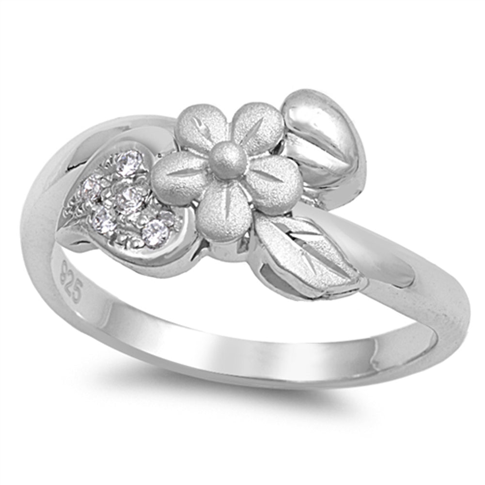 Clear CZ Hawaiian Plumeria Heart Flower Leaf Sterling Silver Ring Sizes 4-9