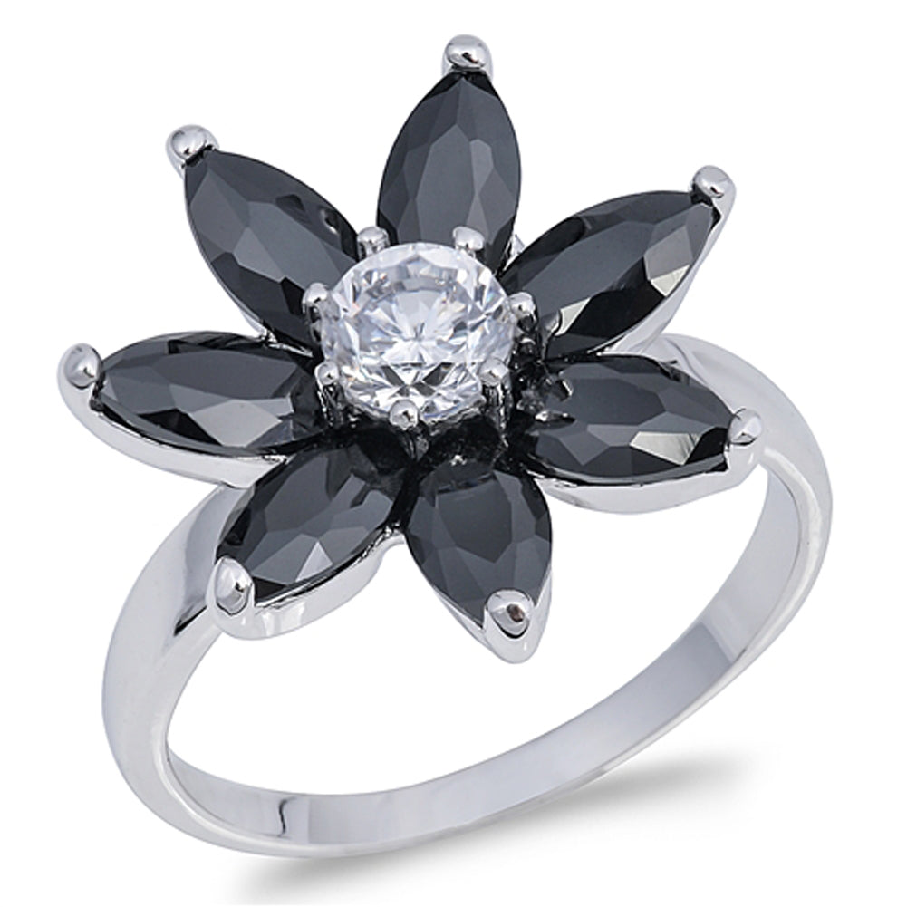 Clear CZ Plumeria Flower Round Prong Ring .925 Sterling Silver Band Sizes 5-9